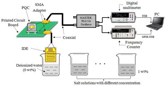 Figure 1 shows the schematic diagram of the whole experimental setup. It is mainly composed of the following four parts: sensing unit, exciting circuit unit, data acquisition and processing unit and various salt solutions with different concentration. The sensing unit is IDE-PQC structure, it consists of an IDE and a PQC connected in series. The IDEs were predesigned and fabricated directly on a thin flexible Polyethylene terephthalate (PET) substrate using the Flexible Printed Circuit Board (FPCB) process. Polyethylene terephthalate (PET) is chosen as the substrate of IDE due to its advantage of flexibility and low cost. Au/Ni/Cu multilayer electrode was successively deposited on the PET substrate using the electrochemical deposition method. The geometric parameters of IDE are 1 cm × 1 cm in size and 200 μm in electrodes separation. The electrodes were patterned by a photo/etching process. The PQCs with two identical silver circular electrodes being deposited on both sides of quartz disk are designed and fabricated by Wuhan Hitrusty Electronics. Multiple PQCs with different diameters of silver electrode are fabricated to study the influence of the electrode area on the performance of IDE-PQC sensor. In this work, the diameter of quartz disk is 8 mm, and three kinds of diameters of silver electrode (5, 4 and 3 mm) are employed. The PQCs that are used in this work are sealed by a metal shell and filled with inert gas in order to provide high QF. The fabricated PQCs are labeled as PQC-5, PQC-4 and PQC-3 as shown in Figure 2, respectively. The electrically exciting circuit unit adopts a commercial phase-locked loop oscillator (Plo10i, Maxtek Inc., Santa Fe Springs, CA, USA), which can excite the IDE-PQC to produce oscillation and provide frequency signal and resonance resistance (Rr) information. The series resistance (Rs) is usually used to evaluate the frequency stability of IDE-PQC sensor. The smaller the series resistance is, the higher the frequency stability. The data acquisition and processing unit includes a frequency counter (53131A, Agilent Technologies, Santa Clara, CA, USA), a digital multimeter (34410A, Agilent Technologies, Santa Clara, CA, USA) and a PC. The frequency counter is used to monitor the frequency of IDE-PQC sensor, and the digital multimeter is adopted to measure the series resistance of IDE-PQC sensor. Three kinds of salt, including NaCl, KCl and Na2SO4, are selected for evaluating the sensing performance of the sensor. The salt solutions with different concentrations are obtained by dissolving salt in deionized water, and the deionized water with a resistivity of 18.24 MΩ·cm is treated as zero concentration. The chemicals are analytical grade and are used without further purification. All of the experiments are carried out at 25 °C without special instructions.