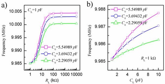 Simulation result of the resonance frequency of IDE-PQC sensor as a function of (a) RL or (b) CL.