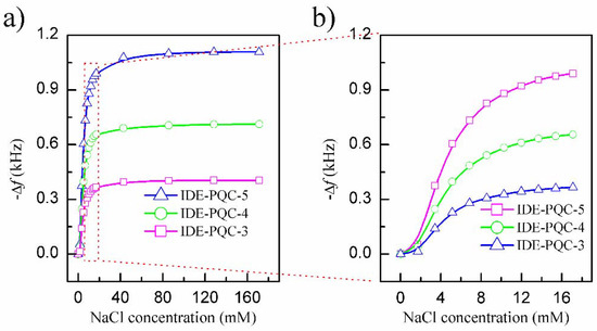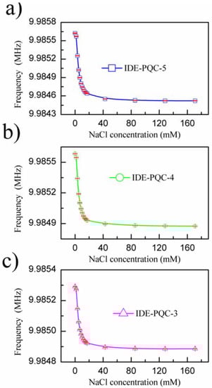 Frequency shifts of IDE-PQC sensor at different NaCl solution concentration.