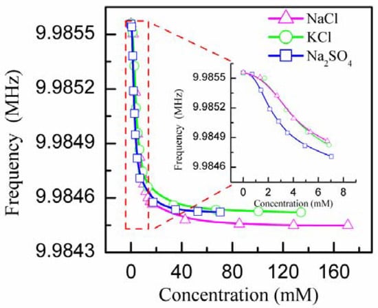 Besides NaCl solution, we have also measured the frequency response of IDE-PQC sensor to other salt solutions, such as the KCl and Na2SO4 solution. The frequency response curves of the IDE-PQC-5 sensor are plotted in Figure 6. The inset of Figure 6 shows the frequency shifts of IDE-PQC-5 sensor in a low concentration range. As is seen, the response trend of IDE-PQC-5 sensor to different salt solutions is basically similar. The frequency of the IDE-PQC-5 sensor decreases monotonically while increasing the solution concentration. Moreover, it can be also found that the frequency response of IDE-PQC-5 sensor to Na2SO4 solution is larger than that of NaCl or KCl solution, and the frequency response of the sensor to NaCl solution is almost equal to that of KCl solution. The observed difference in frequency response of sensors to three kinds of salt solutions can be mainly attributed to the amount of ions. Since Na2SO4 provides the largest amount of ions at the same molar concentration among the three kinds of salts, the frequency shift of the sensor to Na2SO4 in the low concentration range is the largest. The same reason can be used to explain the equal sensor’s signals yielded by NaCl and KCl solution. This result demonstrates that IDE-PQC sensor can be used to measure the concentration of the known salt solution in a low concentration range.