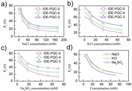 The series resistance Rs of IDE-PQC sensor at different concentrations of (a) NaCl. (b) KCl and (c) Na2SO4 solution, and (d) The comparison of the series resistance Rs of IDE-PQC-5 sensor at different salts solution.