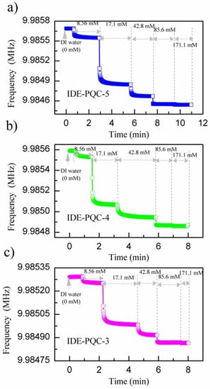 Next, the sensing experiments were carried out by immersing IDE into various NaCl solution concentrations successively, and the resonance frequency of IDE-PQC sensor was recorded. The NaCl solution concentration was varied from 0 to 171.1 mM. Figure 5 presents the measured resonance frequency shifts of the IDE-PQC sensors at different NaCl solution concentration. From this figure, we can see that all the IDE-PQC sensors with different electrode diameters display the same response tendency, and the resonance frequency of the IDE-PQC sensor decreases monotonically as increasing the NaCl solution concentration from 0 to 17.1 mM. Such frequency shifts can be used to determine the unknown NaCl solution concentration. Moreover, we note that the frequency response of IDE-PQC sensors reaches saturation at the concentration of 17.1 mM and upon further increase in the NaCl solution concentration, the generated frequency shifts become relatively constant. This result is in accord with Yao’s work indicating that the IDE-PQC sensor is more suitable for the detection of low concentration salt solution system []. More importantly, it is noteworthy that the detection sensitivity of IDE-PQC sensor is apparently affected by the electrode area of PQC. In particular, the maximum frequency shifts of the IDE-PQC-5 is 991 Hz as the NaCl solution concentration changes from 0 to 171.1 mM, which is about three times larger than that of the IDE-PQC-3. This experimental result is consistent with the simulation results that are described above. The electrode area of PQC directly determines its static capacitance C0 according to the well-known parallel plate capacitance theory. Hence, the IDE-PQC sensor with a larger electrode has a larger C0 value, finally resulting in higher response sensitivity to the change of NaCl solution concentration.