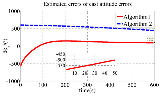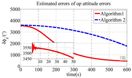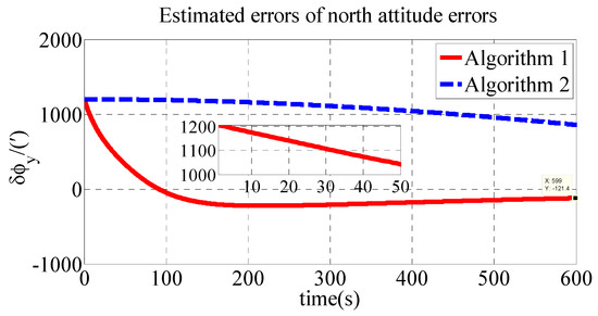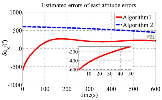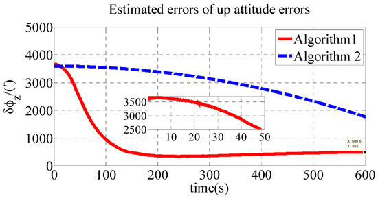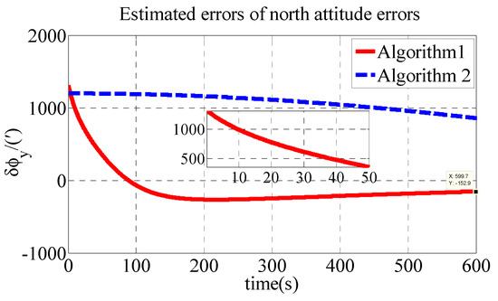 As shown in Table 2, the initial alignment results of , and in Algorithm 1 are 92.04′, −121.40′ and 485′, respectively. The initial alignment results of , and in Algorithm 2 are 442.6′, 857.7′ and 1769′, respectively. The simulation results demonstrate that the proposed polar transversal initial alignment algorithm has better performance than the conventional initial alignment algorithm in the polar region. The attitude errors converge to near zero quickly. In addition, the attitude errors are then stable near zero. The polar transversal initial alignment algorithm can realize the initial alignment in the polar region effectively, especially when large misalignment angles occur.