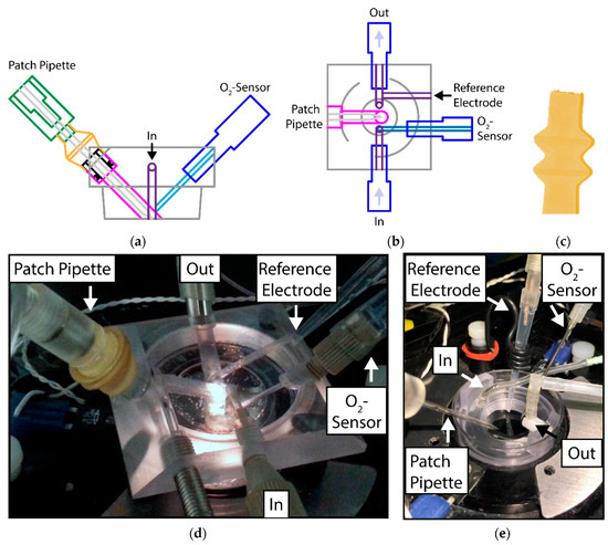 The design of the microfluidic system drawn in a CAD program was based on (1) the number of entrances and outlets needed (for inflow, outflow, patch-pipette, reference electrode and O2-sensor) and (2) the shape of the dishes used for PASMC cultivation. Some views of the CAD drawings are shown in Figure 1a,b.
