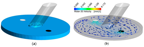 Surface level (a) and velocity streamlines (b) from inlet (white) to outlet (black) after 100 s.