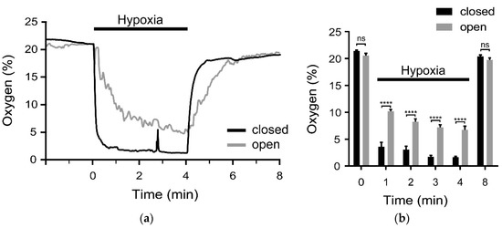 (a) Oxygen content inside the open (grey trace) and the closed, microfluidic system (black trace) upon switching from normoxic to hypoxic solution (indicated by the black bar). O2-curves are superimposed for better comparison and representative for n = 6 each; (b) Statistical analysis of experiments depicted in panel (a). Under hypoxic conditions, the O2-content was significantly lower in the closed, microfluidic system (black), compared to the conventional open system (grey). The 2-way ANOVA with Tukey’s multiple comparison test; ns: not significant p ≥ 0.5, **** p ≤ 0.0001.