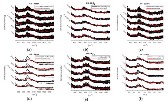 Reconstruction of the Raman response from measurements on PASMCs—Redox, H2O2 and control. (a–c) are from the closed microfluidic system (CS) and (d–f) are from the open system (OS). The 2 min mark is the initial stage, 6 min mark is the HOX-spectra followed by recovery. The reconstructed curve (red) is placed on top of the semi-treated data (black).