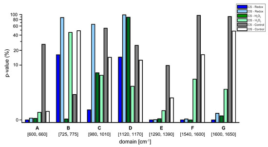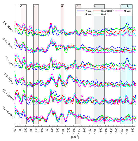 The variations of the spectra—especially in the regions of the biomarkers (A–G)—are much more pronounced in the redox and the H2O2 experiments than in the control measurements (see Figure 6).
