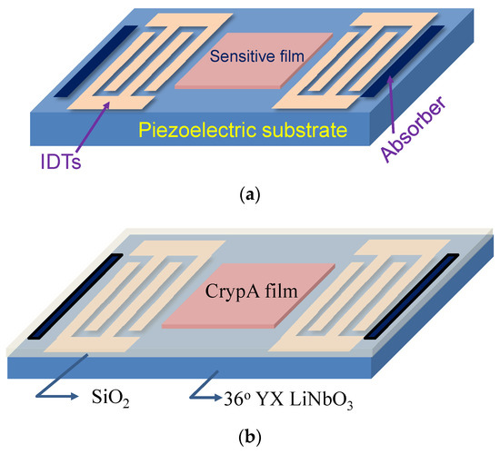 The schematic of SAW based gas sensor (a) and Love wave based sensor (b).