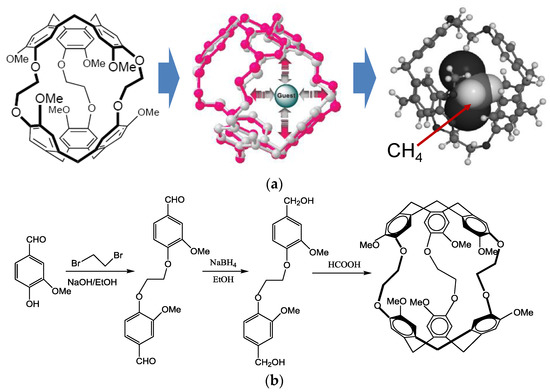 (a) supramolecular interactions of CrypA towards CH4 and (b) synthesis of cryptophane-A.