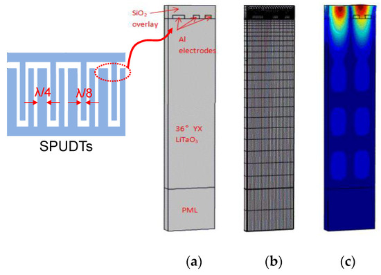 FEM analysis on Love wave devices (a) waveguide structure of SiO2/Al electrodes/36° YX LiTaO3; (b) Meshing structure and (c) Love wave displacement profile.
