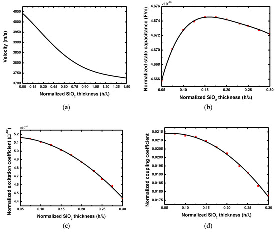The calculated COM parameters varying with SiO2 thickness: (a) velocity; (b) static capacitance; (c) excitation coefficient and (d) coupling coefficient.