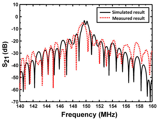 The frequency response (S21) of the Love wave device was characterized by using the network analyzer as shown in Figure 6. Lower insertion of less than 5 dB was observed thanks to the waveguide effect and SPUDTs structure, which is in accordance with the theoretical prediction. Also, the temperature characteristic of the proposed Love wave device was performed by measuring its corresponding frequency response at various temperatures, as shown in Figure 7. It denotes that excellent temperature stability (TCF of 10 ppm/°C) was achieved by using the strategic guiding structure over the SH-SAW device on 36° YX LiTaO3 (39.8 ppm/°C).