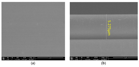 The SiO2 guiding layer with various thicknesses was deposited on the entire surface of the prepared patterned LiTaO3 wafer by ion-assisted e-beam evaporation. High-purity (99.99%) SiO2 target and vacuum degree of 10−4 Pa were utilized. The ion energy in ion-assist is adjusted to 120 eV, and the efficiency in evaporation is set to 1 nm/s. To prevent breakage of the piezoelectric substrate in the process of thicker SiO2 deposition over 200 °C, the e-beam evaporation was used for thicker SiO2 deposition at room temperature of 25 °C. The prepared SiO2 overlay with thickness of ~5 μm was characterized by AFM, the corresponding AFM picture indicates satisfactory quality of the SiO2 coating as good uniformity and less surface pollution, as shown in Figure 6.