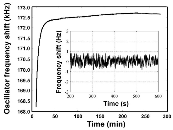Obviously, the frequency stability of the oscillator affects directly the detection limit and stability of the sensor system, hence, a measurement on the frequency stability of the oscillator was conducted, as shown in Figure 10. After 20 min, the sensor reached a relatively stable state, and excellent short-term (in second) and medium-term (in hours) frequency stability were achieved as ±1 Hz/s and ±10 Hz/h.