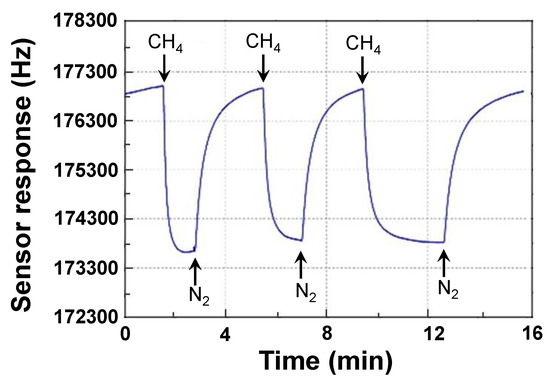 Using the experimental setup composed of the proposed sensor system, air bags, hygrometer, thermometer, and PC, the Love wave sensing devices were characterized, as shown in Figure 11. First, the repeatability of the CrypA coated Love wave device was evaluated, as shown in Figure 12, that is a response profile obtained from the three consecutive 3 min on-off exposure to 5% CH4 in pure N2 at temperature/humidity of 25 °C/50% RH using the prepared Love wave sensing device. Excellent reproducible run was observed from the three gas exposures. Also, the picked sensor signal rises rapidly upon exposure to 5% CH4 and reaches the equilibrium value in 15 s, and then returns to its initial status within 20 s after removing the CH4. It means fast response time and recovery time with good repeatability were achieved from the developed Love wave sensor prototypes at room temperature.