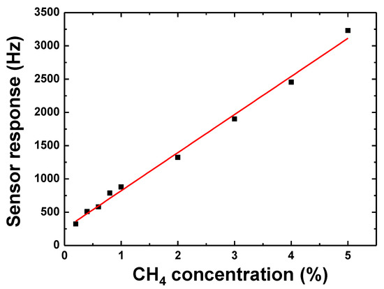 Figure 13 shows the sensor response at various CH4 concentration. It can be seen that the response is quite linear at CH4 concentrations of 0.1~5%, and the fitted slope is ~624 Hz/%, which is three times that of a similar sensor using R-SAW [10]. Also, a relatively high response of ~280 Hz is observed from the proposed Love wave sensing device upon exposure to 0.1% CH4, which means that a low detection limit of 0.005% is expected when a linear response was assumed at lower concentrations according to the International Union of Pure and Applied Chemistry (IUPAC) [6] norms.