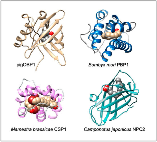 A fourth family of soluble binding proteins is now recognized as being involved in chemoreception. These proteins, named Niemann-Pick C2 (NPC2) after the discoverers of the related disease, have been known for a long time as carriers for cholesterol and other lipids in vertebrates [58,59]. Only recently, their large duplication and differentiation in arthropods has suggested a role in semiochemical detection and differentiation in insects and other arthropods [30,32,49,60,61,62]. The folding of these proteins, made of β-sheet segments, recalls that of lipocalins, being however well distinct from that of vertebrate OBPs. Figure 1 shows the structures of binding proteins representative of all the four classes described above.