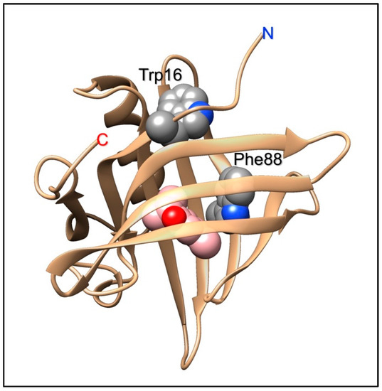 Structure of the pig OBP1. Tryptophan 16 is part of the lipocalin signature and is located outside the binding pocket. In a mutant designed to act as biosensing element for polyaromatic hydrocarbons, phenylalanine 88, which is located inside the binding pocket, was mutated into a second tryptophan residue, that would act as fluorescent reporter to monitor the presence of aromatic ligands in the binding site.