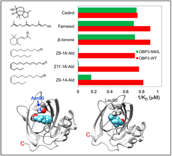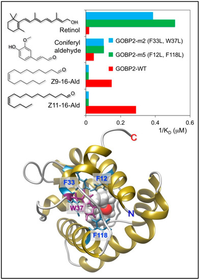 On this basis of information, the structure of P. xylostella GOBP2 was modified by replacing two aromatic residues in its binding pocket with leucine. As a result, the specificity of this protein was switched from linear aldehyde pheromones to branched-chain terpenoids [86]. Figure 4 summarizes the results of this study. This work shows how feasible it could be to completely change the binding properties of an OBP by replacing only one or two residues in the binding pocket, while keeping the scaffolding of the protein virtually intact.