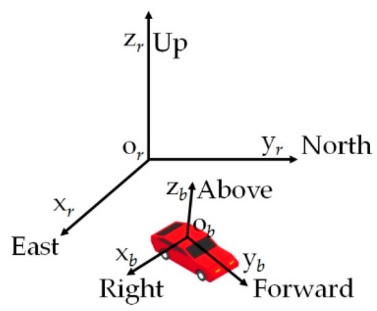 The reference fame and body frame are shown in Figure 1. For a land vehicle, the running direction can be arbitrary in reference frame, but in the body frame, which is attached to the vehicle, its running direction is always forward, although the forward direction may change in reference frame. The “forward direction” is the y direction in the body frame defined in this paper. Dissanayake et al. [30] have pointed out that, when the vehicle does not jump off the ground and does not slide on the ground, velocity of the vehicle in the plane perpendicular to the forward direction is zero, hence and can be assumed as zero. Using this assumption and substituting (16) and (23) into (22), we simplify the x-axis component of (22) as: