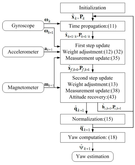 Obviously, the yaw derivative is related to pitch, roll, , and . In the fusion algorithm, the estimation of pitch and roll will be corrected by the accelerometer measurement (in the form of correcting quaternion), which is immune to magnetic disturbances. The two-step measurement update method which will be introduced in Section 3.2 makes pitch and roll estimation immune to the errors induced by magnetometer measurement update. In addition, generally speaking, the pitch and roll are small for land vehicles, hence the absolute value of the coefficient of is greater than that of . Therefore, the z-axis bias component is of more importance, especially in magnetically disturbed environments. Equation (21) is based on Euler angles, but it should be noted that both quaternion and Euler angles are representation of orientation, and orientation obeys a unique dynamic rule. In other words, the quaternion propagation models is different from that of Euler angles, but when they are used to represent a same orientation parameter, for example yaw, the parameter obeys a same dynamic rule no matter what representation is used.