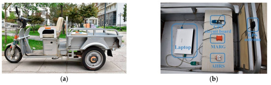 The test vehicle and experimental devices are shown in Figure 3. A Motion Tracker MTi-28A53G35 (Xsens, Enschede, The Netherlands) [31] was used as the MARG sensor. The Global Position System (GPS) unit (Unicoremm, Beijing, China) provided reference values of longitude, latitude, and forward velocity. 3-axis gyro module STIM210 (Sensonor AS, Horten, Norway) was used as the attitude and heading reference system (AHRS), which provided reference values of the yaw and attitude. The initial value of the AHRS was computed with the static accelerometer and magnetometer outputs [32]. The laptop (Lenovo, Beijing, China) supplied power for the MARG sensor, GPS unit, and the AHRS, and logged data from them at 100Hz. The GPS unit, MARG sensor, and AHRS were mounted on the test vehicle with the sensor and AHRS frames aligned with the vehicle body frame. In experiments, the vehicle was driven along test trajectories, which consisted of straight lines, corners with different angles and a circular line, involving a full range of yaw. Note that the magnetic sensor had been calibrated inline according to the sensor manual [20]; hence, we assumed that the impact of the hard and soft iron effects had been eliminated.
