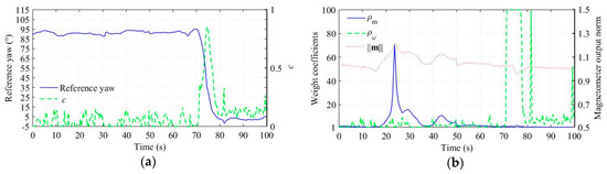 Adaptive weight coefficient based on the vehicle status. (a) Reference yaw and c. Because the reference yaw and c have different value range, two vertical axes are used for clarity with the right one corresponding to c. (b) and . The magnetometer output norm is also plotted to show the relationship between magnetic disturbances and , and, similar to (a), two vertical axes are used with the right one corresponding to . To obtain a proper vertical axe limit and thus the trends of curves can be showed clearly, the maximum value of the weight coefficients is set to 100.