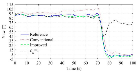 We processed the sensor outputs using the conventional and improved algorithm, respectively, and the yaw estimation results are shown in Figure 5. The results demonstrate that the improved algorithm has better estimation accuracy, and the reasons may be analyzed as follows. In the conventional algorithm, the magnetometer measurement update corrects the yaw estimation from drifting, but the measurement weight will be adjusted down in the presence of magnetic disturbances (Figure 4b shows obvious differences between the norm of magnetometer output and one from about 15 s to 50 s implying the presence of magnetic disturbances). As a result, the correction effect attenuates and thus the yaw estimation drifts. In contrast, the gyroscope measurement update provides another correction in the improved algorithm, and more importantly, the correction can hardly be attenuated by magnetic disturbances as analyzed in Section 3. The adaptive weight coefficients shown in Figure 4b verify the function of the gyroscope measurement update: is much lower than in the presence of magnetic disturbances. In fact, represent the validity of the gyroscope measurement, which is not affected by magnetic disturbances. Hence, the gyroscope measurement can be used in magnetically disturbed environments. The real-time adjusting is critical for the gyroscope measurement to work effectively. Figure 5 also shows the yaw estimation result when is set to constant 1. The result demonstrates that the constant causes erroneous correction from the gyroscope measurement when the vehicle is turning, and hence results in significant estimation errors.
