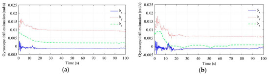 In Section 3.1, we draw a conclusion based on Equation (21) that estimation is more important than and estimation in the fusion algorithm. To verify this conclusion based on experimental data, we constructed a conventional adaptive fusion algorithm using quaternion as state variables, and using Equation (6) as measurement equation. Note that, in this algorithm, the gyroscope bias is not estimated and compensated, and hence it will always impact the quaternion propagation. To examine the impact of the gyroscope bias, we added a constant bias on the reference angular rate provided by the AHRS and used the biased value to realize the quaternion propagation in the fusion algorithm.