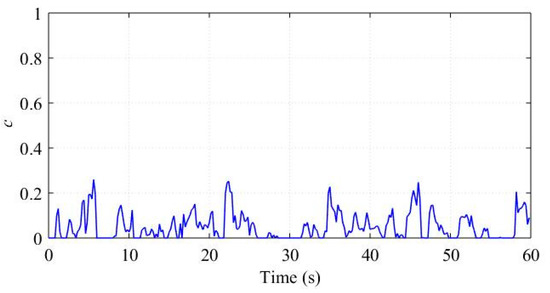 The vehicle met a bump or ditch at about 7 s, 19 s, 27 s, 45 s, and 58 s. Obviously, the bumps and ditches cause oscillations of the sensor outputs. Figure 9 demonstrate that the bumps and ditches do not affect c significantly, which displays small values and is consistent with the running straight status.