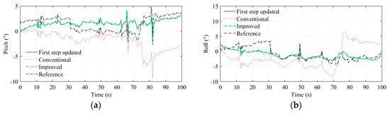 In the experiments, the test road is basically level except for some speed breaks. To evaluate the performances of the two-step measurement update method, we computed attitudes using the quaternion [33] from the first step update, the conventional algorithm and the improved algorithm respectively, and the results are shown in Figure 10. Obviously, the improved algorithm and the first step update have the same attitude estimation, which verify that the second step update do not modify the attitude estimation. In addition, the attitude estimation of the improved algorithm is more consistent with the reference values than the conventional algorithm. The comparison demonstrates that the two-step measurement update method eliminates the attitude estimation errors induced by the magnetometer measurement update. Besides magnetic disturbances, the magnetometer measurement error can also cause attitude estimation errors. For example, the attitude estimation of the conventional algorithm change incorrectly during the turning of the vehicle (70–80 s), and similar phenomena can be found in other turning processes, which, we think, is due to the dynamic errors of the magnetometer.