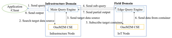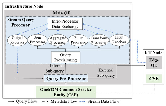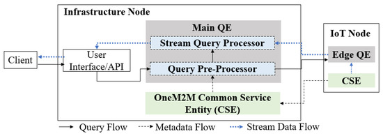 Figure 7 shows a more detailed schematic of the QE architecture inside OMQ. A QE consists of two modules: query pre-processor, which performs query planning tasks, and a stream query processor, which performs the stream processing according to a given query. Each QE is connected with oneM2M CSE for communicating between the data sources and the query processor. The main QE is also connected with the edge QE located inside several IoT nodes in the field domain. The edge QE uses mostly the same part as the main QE, with the query pre-processor part removed, as the pre-processing is done mainly in the infrastructure side.