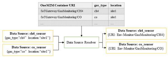 Figure 9 explains how the data source resolver works. Two data sources with each search property are obtained from two different sensors such as ch4_sensor and co_sensor. Each data source is mapped quickly to the corresponding oneM2M container URI by checking metadata mapping table M. The data source resolver outputs each data source with the corresponding matching container URI information.