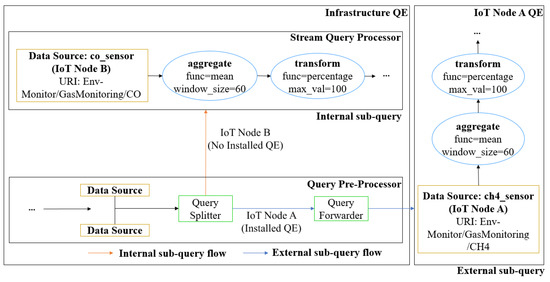 Based on the sub-query for data source ch4_sensor, the query splitter checks the corresponding IoT node whether it has its own QE or not. Since the corresponding IoT node A for ch4_sensor evidently has its own QE, then the sub-query is forwarded by query forwarder to the IoT node A. This is a case for the external sub-query. For another sub-query for data source co_sensor, the corresponding IoT node B is checked by query splitter. It turns out that the IoT node B does not have its QE. Therefore, this sub-query is directly forwarded to the stream query processor module and handled by the QE of the infrastructure node. This is a case for the internal sub-query.