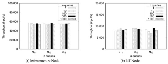 Figure 13 displays the benchmark results for the throughput in the infrastructure node and IoT node. The throughput in the infrastructure node reaches around 50,000–60,000 input/second in the infrastructure node and around 8000–9000 input/second in the IoT Node. The throughput stays around this range regardless of the query number and query type. The throughput of the infrastructure node always tends to be higher than that of the IoT node, since the infrastructure node has more powerful hardware.