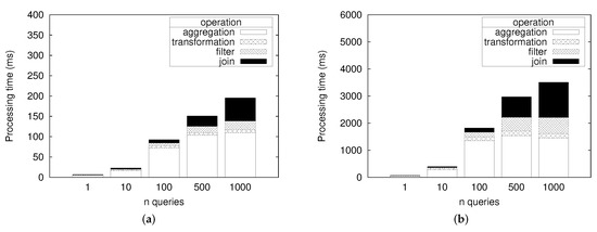 Total processing time for query for processing 100K of data. (a) Infrastructure Node; (b) IoT Node.