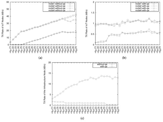 Network transfer rate. (a) IoT Node without QE; (b) IoT node with QE; (c) the infrastructure node.