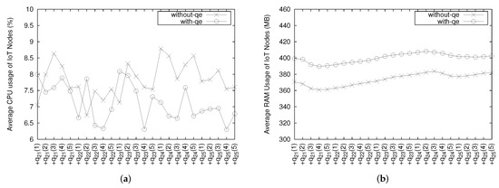 The average CPU and memory usage of all IoT nodes, with increase in the number of queries, are depicted in Figure 17. As we can see in Figure 17a, the CPU usage of the IoT node without QE is generally a bit higher than that of IoT node with QE. It happens because when an IoT node does not have QE to process the query operation itself, it sends the all data to an infrastructure node for further processing in the infrastructure QE. Consequently, the data communication overhead between an IoT node and an infrastructure node affects the higher CPU usage in the IoT node. However, the memory usage when implementing QE on each node is higher by about 30–40 MB as shown in Figure 17b.