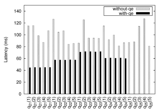 Figure 18 indicates the average latency of each query after running all applications simultaneously. The latency for a given query is calculated as the sum of data transfer latency and data processing time. At this case, we observe that the latency for using QE is not measured. Since the CPU temperature of IoT node 3 never exceeds the minimum threshold which specified by query , the QE does not send any results to the application. Another observation is that the latency when using QE is generally lower than that without using one. One possible reason for such phenomena is that the higher the bandwidth it takes to transfer data from the IoT node, the more prone it becomes to higher network latency. The latency for each query when an application performs query without QE varies even within the same query, whereas the latency is almost the same within the same query when an application performs a query with QE because of the data-sharing mechanism.
