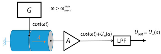 Here, the exciting generator G creates a harmonic signal with frequency ω and directs it to the piezoelectric transducer, divided into two parts: exciting and sensitive. Each of them is a cylinder made of piezo ceramics, with longitudinal polarization. One of the sides of the converter exciting part is rigidly fixed, and the second is rigidly connected to the sensitive part through the electrode to which the generator is connected. The second part also acts as a test mass (if necessary, to increase the sensitivity of the sensor, the free end of this converter can be additionally loaded). Under the action of the exciting signal—in which the frequency ω should be higher than the maximum frequency of the acceleration to be measured—the converter performs harmonic oscillations and a corresponding signal appears at the output of its sensitive part. The latter goes to the amplifier A and then to a low-pass filter (LPF), which forms a constant voltage Uout equal to the midline of the harmonic signal. It should be noted that for an excitation signal any alternating signal, including centered random noise, might be used.