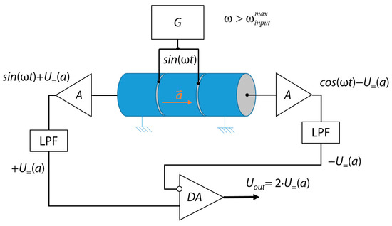 Under the action of acceleration, a rod—formed by piezoelectric transducers—deforms and an additional charge proportional to the actual acceleration is excited on the electrodes of the sensitive part. As a result, the midline of the harmonic output signal will change its position and, after that, the value of the voltage Uout taken from the filter output will change. In this case, the acceleration measurement range will be primarily determined by the parameters of the amplifier and can be easily adapted to the requirements of a particular consumer or even changed during the sensor operation. The output signal is presented by a constant voltage, convenient for further processing. It is necessary to emphasize that the piezoelectric part is always in a dynamic mode. Literally, it means that the effect of a charge leakage is almost neglected, because its time constant is much higher than the one of the excitation signal. By the time that the charge leaks by a significant value, the total output voltage already changes its sign.