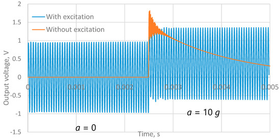 The time variation of the electric potential on the surface of the free end of the piezoelectric transducer was evaluated. As expected, the midline of the harmonic signal generated by the exciter has shifted (Figure 3). At the same time, during the entire time of acceleration acting, it does not change, despite the possible leakage of charge. A line depicting a change of output signal without excitation but with other parameters the same is also plotted for comparison. Thus, the operational performance of the proposed concept is confirmed.