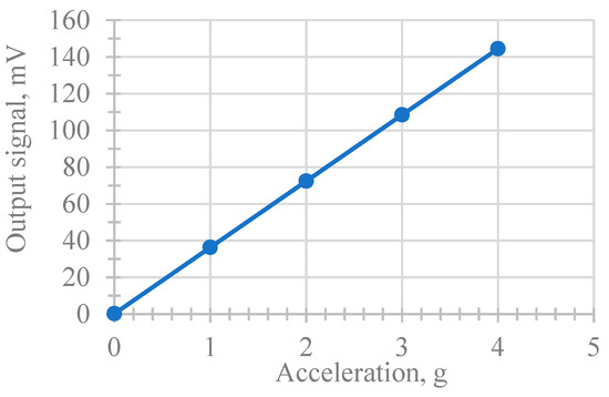 As can be seen from Figure 4, the output characteristic is linear. The value of the scale factor along the x-axis (measuring one) was 36 mV/g. The sensitivity along the y and z axes was 0.29 and 0.12 mV/g, respectively.