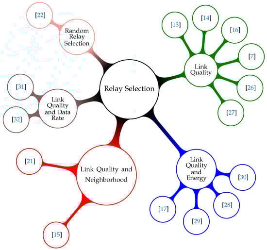 The adequate selection of relay nodes is fundamental to improve the performance of cooperative communication techniques []. There are multiple schemes to select relay nodes in the literature. However, many of these works usually focus on the analysis of the data communication protocols, evaluating and proposing different techniques for sending messages (or signals) by the relay nodes, based on Amplify-Forward (AF), Decode-Forward (DF) or Hybrid approaches [,,]. As a limitation of these works, it can be mentioned that they do not deal with the selection of retransmission nodes, or, when they do, they assume only a single criterion for such a selection. This work aims to improve the relay selection in WSNs. In this way, the objective of this section is to describe state-of-the-art approaches that mainly deal with the relay selection procedures. Then, state-of-the-art selection schemes were classified into five categories, according to the criteria used for the relay selection: Link Quality Based [,,,,,], Link Quality and Energy Based [,,,], Link Quality and Neighborhood Based [,], Link Quality and Data Rate Based [,] and Random Relay Selection [] (Figure 2).