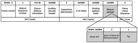 The payload field of the beacon frame is used to send three parameters, Relay Set, which is the information with the identifiers of the selected relay nodes, Start of Slots for Retransmission, which reveals which is the first slot for retransmission (retransmission slots are contiguous slots that are allocated after the transmission slots) and , which reveals if the nodes should listen to their neighbors in this beacon interval (BI) or not. Figure 3 illustrates the beacon frame structure.