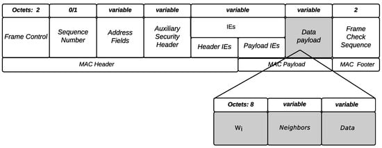 The data payload field is also used by nodes to piggyback two types of information for the coordinator: Neighbors, which reveals the list of neighbors of each particular node and that reveals its benefit value (described in Section 3.3). Figure 4 illustrates the frame structure of a data message.