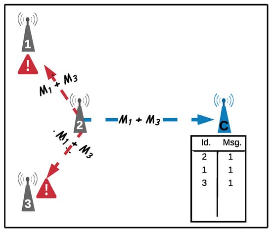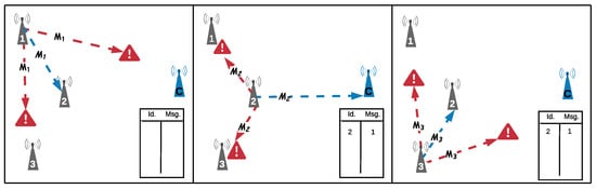 After notifying all the relay nodes, the communication will occur in two steps: transmission and retransmission. In the first step, as illustrated in Figure 5, each node make a transmission attempt, the set of relay nodes will stand by listening to and storing all messages sent by all nodes, storing both the successfully received messages and the identification (id) of the sending node. If the node is not a relay, it will enter into a sleep mode when finishing the transmission step ( and in Figure 5).