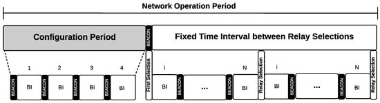 When a node joins the network, it synchronizes itself with the beacon message sent at the beginning of the beacon interval (BI). Considering a time-slotted medium access, all nodes will make a transmission attempt during their respective time slot. During the first BIs, the network still does not have any relay. After starting the network operation, there will be a configuration period within which nodes will identify their neighbors, calculate the benefit function value (described later), and send this information back to the coordinator node. Only the nodes with RSSI greater than or equal to dBm will be added as neighbors, as this value indicates that there is an adequate communication link between them, as suggested by [].