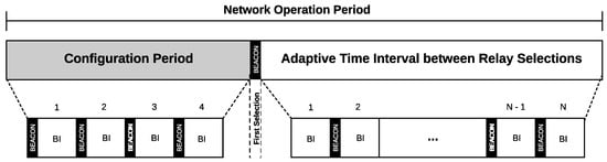 After the first selection of relay nodes, the interval between selections will be defined according to the used selection scheme (PRS or ARS). Therefore, this interval can be fixed (PRS) or adaptive (ARS). During the two BIs that precede a new relay selection, all nodes of the network will remain active until the end of the transmission step, as they need to listen to the nearby nodes to update their list of neighbors.